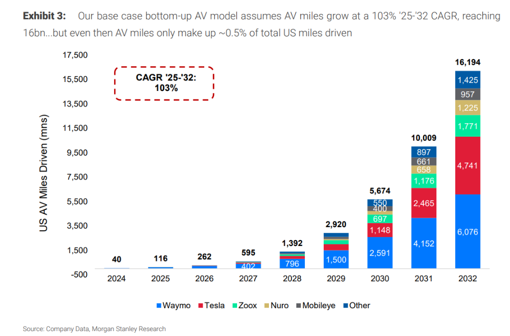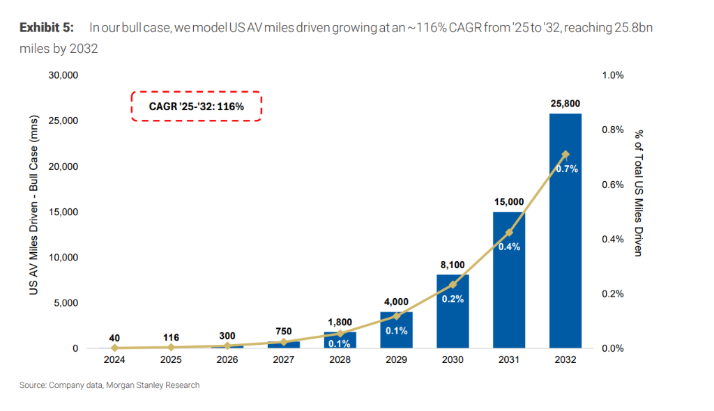 市场爆发性增长: 预计从2025年到2032年,美国自动驾驶里程将增长140倍,达到160亿英里。