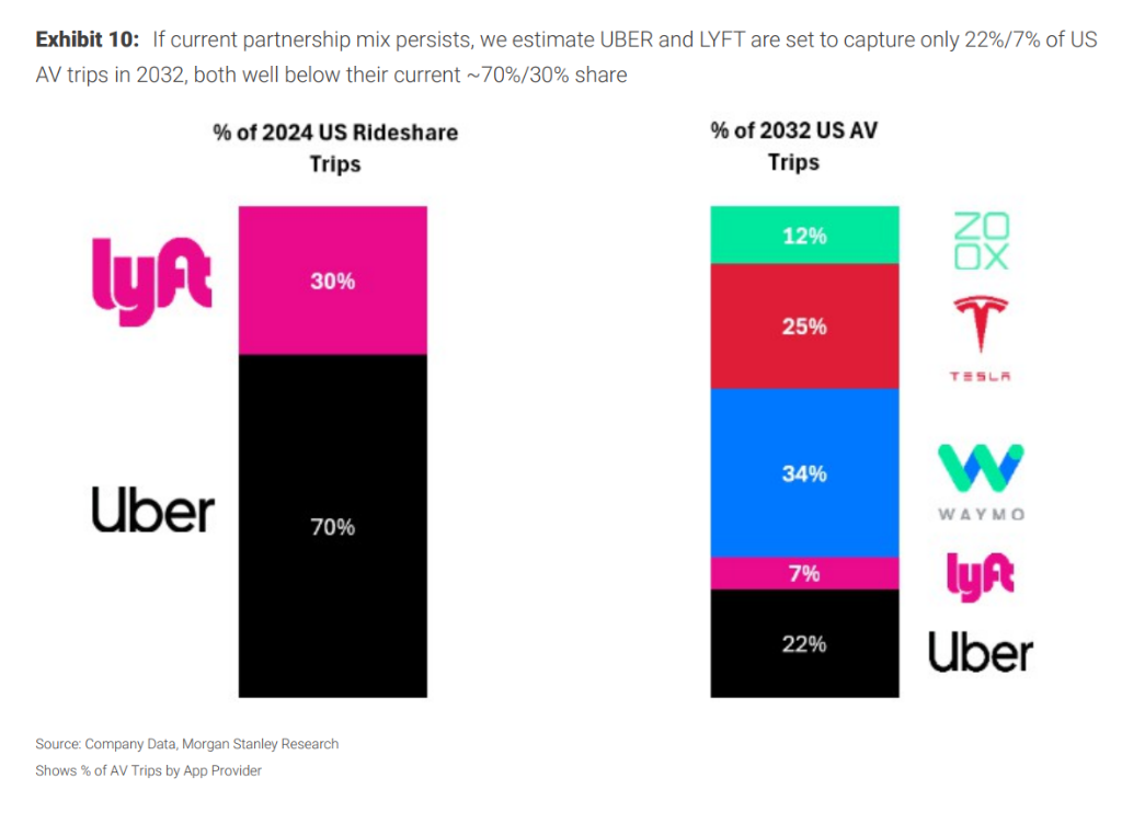 优步/Lyft的至暗时刻? 随着自动驾驶技术商的崛起,传统网约车平台的护城河面临严峻挑战。摩根士丹利预测Uber和Lyft在自动驾驶领域的市场份额将大幅缩水,并因此下调了对这两家公司的估值倍数约10%。