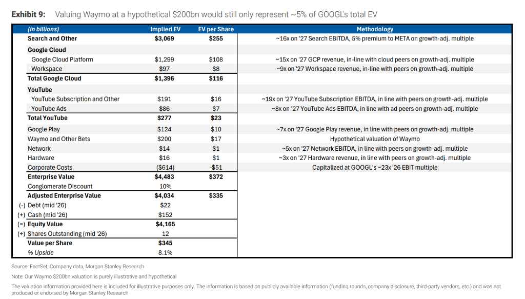 估值测算: 即使在假设情境下将Waymo估值提升至2000亿美元(相当于Uber全球网约车和外卖业务的总和),这也仅占Alphabet当前企业价值的约5%。
